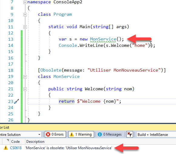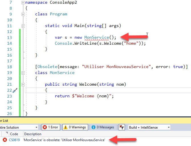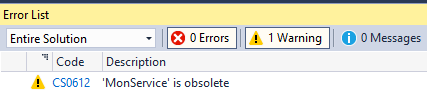 Un dernier paramètre peut être passé à cet attribut. Le paramètre error: permet d'indiquer grâce à un booléen une erreur de compilation et donc bloquer le build de la solution. Nous voyons également que Intellisense souligne l'avertissement d'un trait rouge l'utilisation de la classe MonService.
