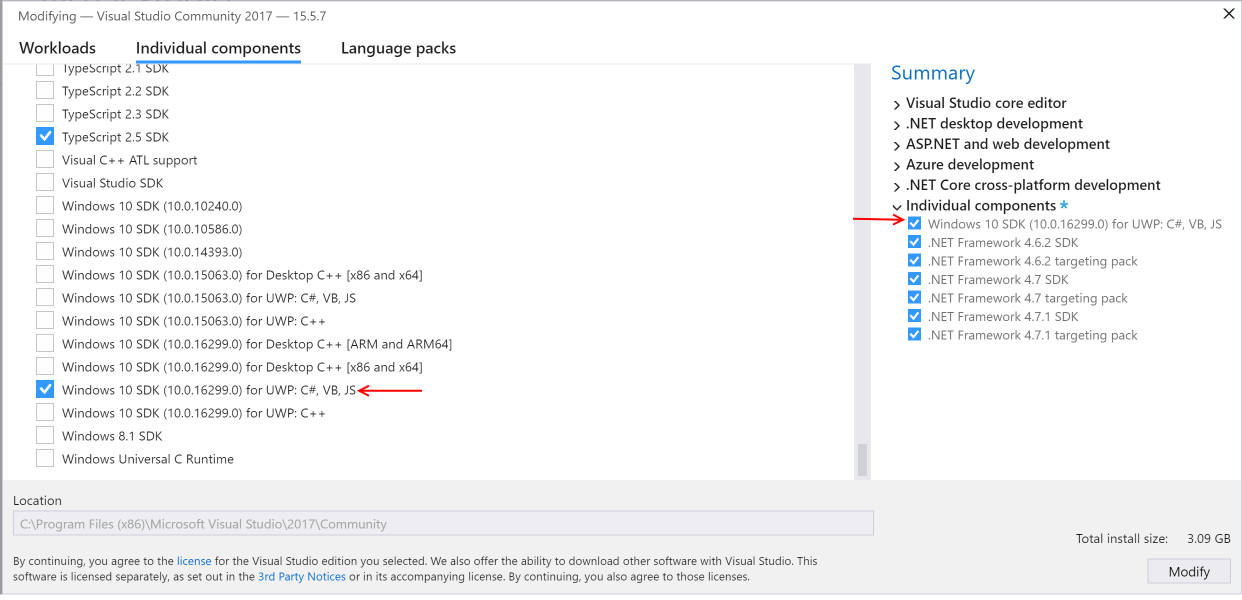 Faites une recherche sur le fichier inspect.exe, s'il est disponible vous pouvez avancer un peu, sinon vous devez lancer l'installer de Visual Studio 2017, modifier votre installation, cliquez sur Individual Components et sélectionnez Windows 10 SDK (10.0.16299.0) for UWP: C#, VB, JS, votre interface doit ressembler à ça normalement: