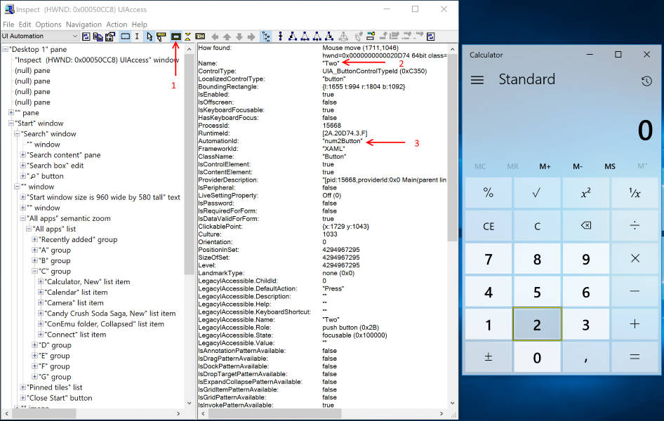 Install-Package FlaUI.UIA3Nous allons faire faire à la calculatrice l'opération 2+2. Pour commencer nous devons trouver tous les identifiants pour chaque bouton et la textbox pour le résultat. Nous allons lancer à la main la calculatrice et inspect.exe et chercher les propriétés automationId et name dans Inspect.